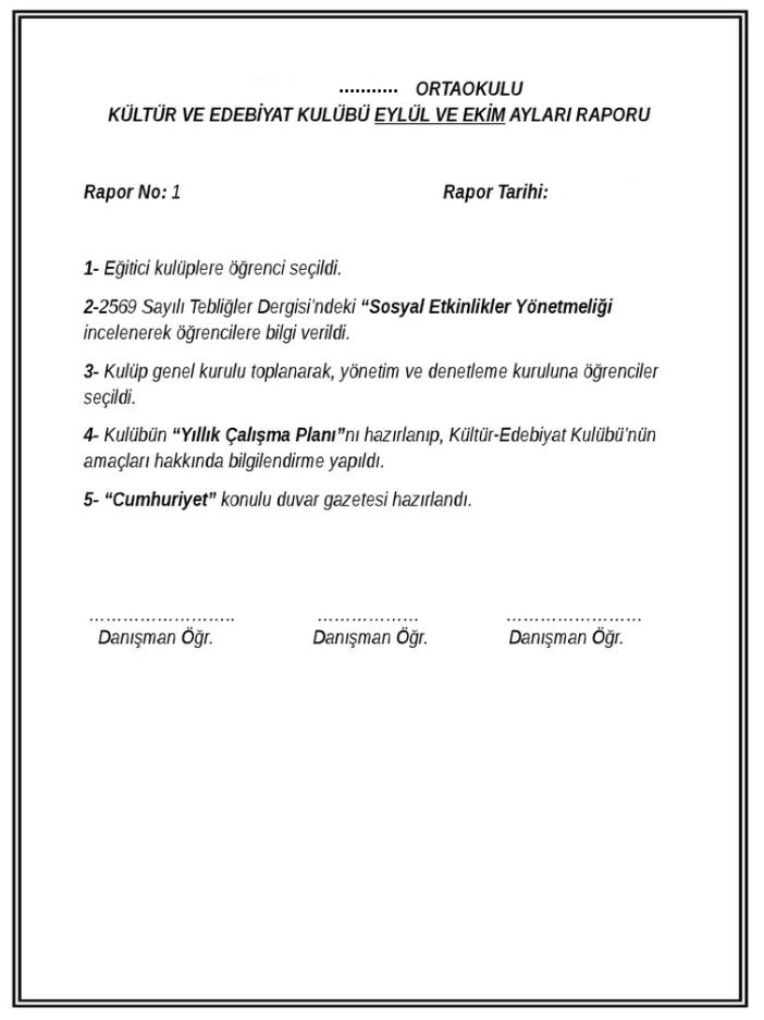 “Sosyal Etkinlik Kulüp Raporu” Sosyal kulüplerin yapacakları çalışmalar ile faaliyetlerin tarihlerini içeren bir rapordur. Sosyal etkinlik kulüp raporu 1. ve 2. dönem sonlarında hazırlanan bir rapor türüdür. Yani her iki dönemde de hazırlamak gereklidir. Sosyal etkinlik kulüp raporundaki amaç dönem başında planlanıp yapılması gereken tüm etkinlik faaliyetlerinin başarıyla tamamlanmasını sağlamaktır.